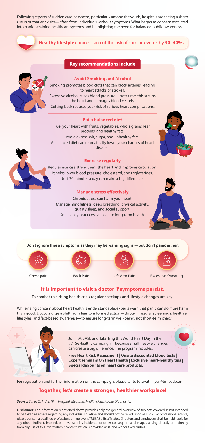 Amid rising concern over sudden cardiac events—especially among the youth—this communication emphasizes the need to replace panic with informed action, highlighting that healthy lifestyle choices like avoiding smoking and excess alcohol, eating balanced diets, exercising regularly, managing stress, and seeking timely medical advice can reduce heart risk by 30–40%, while inviting employees to join TMIBASL and Tata 1mg’s World Heart Day #DilSeHealthy campaign to promote proactive, sustainable heart health at the workplace.
